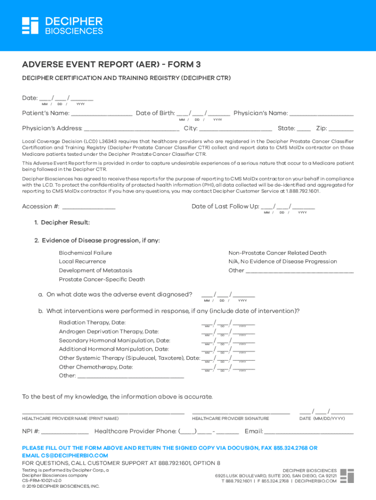 ADVERSE EVENT REPORT (AER) FORM 3 DECIPHER CERTIFICATION AND TRAINING REGISTRY (DECIPHER CTR) Date: / / MM /DD/YYYYPatients Name: Date of Birth: / / Physicians Name: MM /DD/YYYYPhysicians Address: