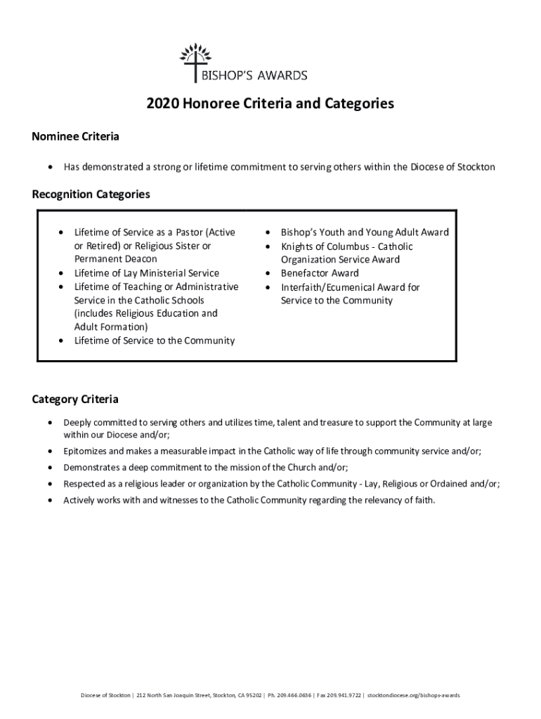 2020 Honoree Criteria and Categories Nominee Criteria Has demonstrated a strong or lifetime commitment to serving others within the Diocese of StocktonRecognition Categories Lifetime of Service as