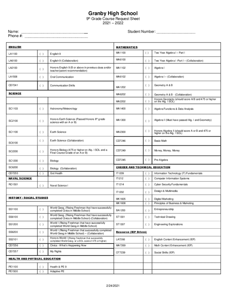 Granby High School 9thGrade Course Request Sheet 2021 2022Name: Phone #: Student Number: ENGLISHMATHEMATICSLA1100()English 9MA1100()Two Year Algebra I Part ILA6100()English 9 (Collaboration)MA6100()Two