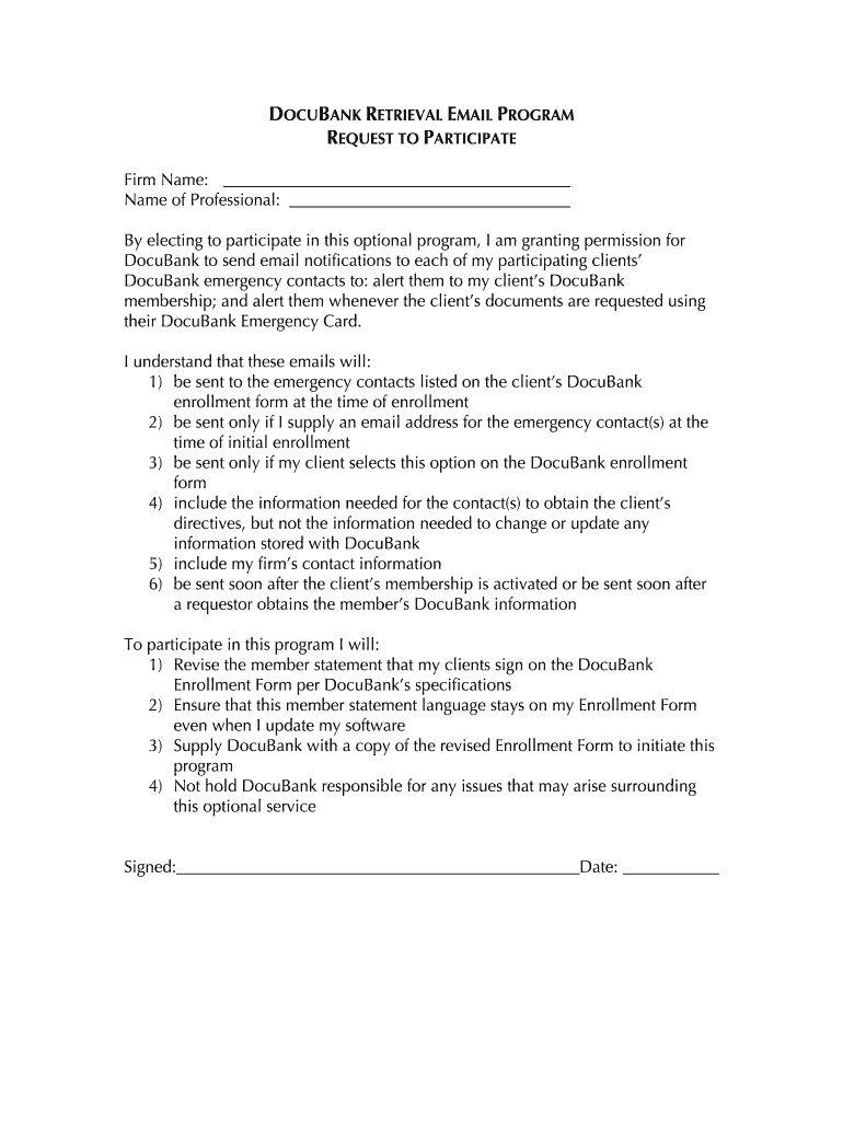 The DocuBank Email Notification Program Request is a business form used by professionals to grant permission for DocuBank to send email notifications to clients' emergency contacts.