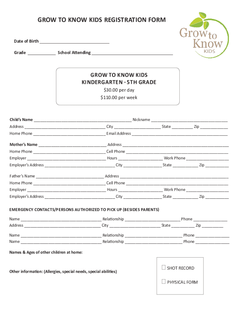 GROW TO KNOW KIDS REGISTRATION FORM Date of Birth Grade School Attending GROW TO KNOW KIDS KINDERGARTEN 5TH GRADE $30.00 per day $110.00 per weekChilds Name Nickname Address City State Zip Home Phone