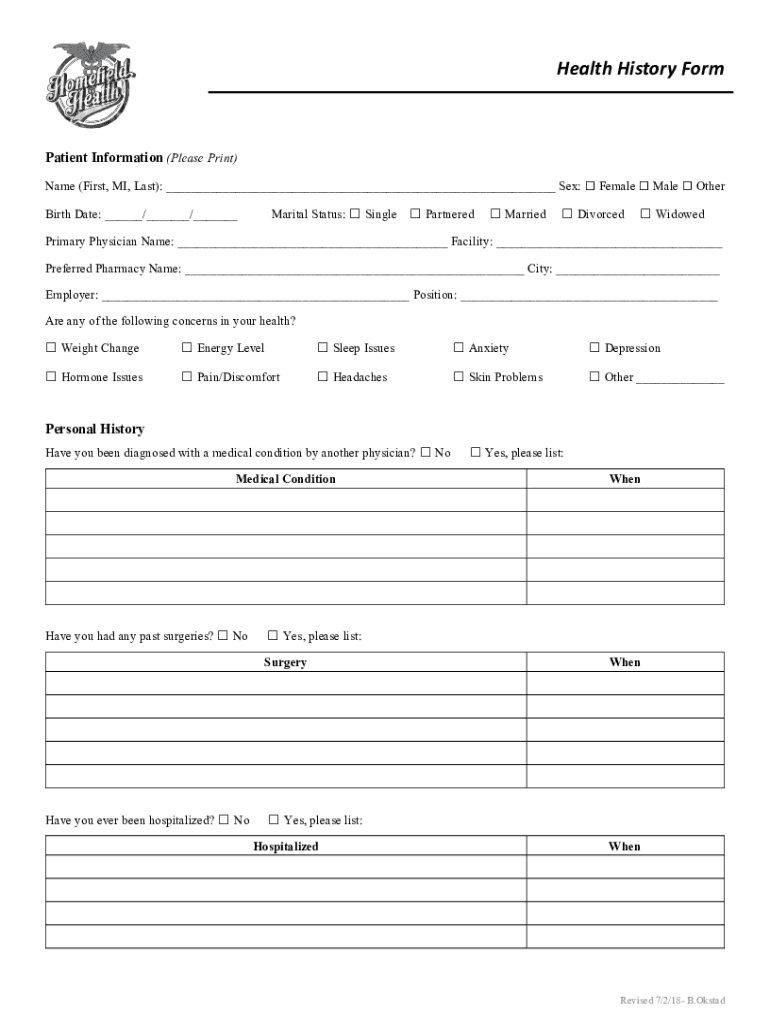 Health History Formation Information (Please Print) Name (First, MI, Last): Sex: Female Male Other Birth Date: / / Marital Status: Single Partnered Married Divorced WidowedPrimary Physician Name: