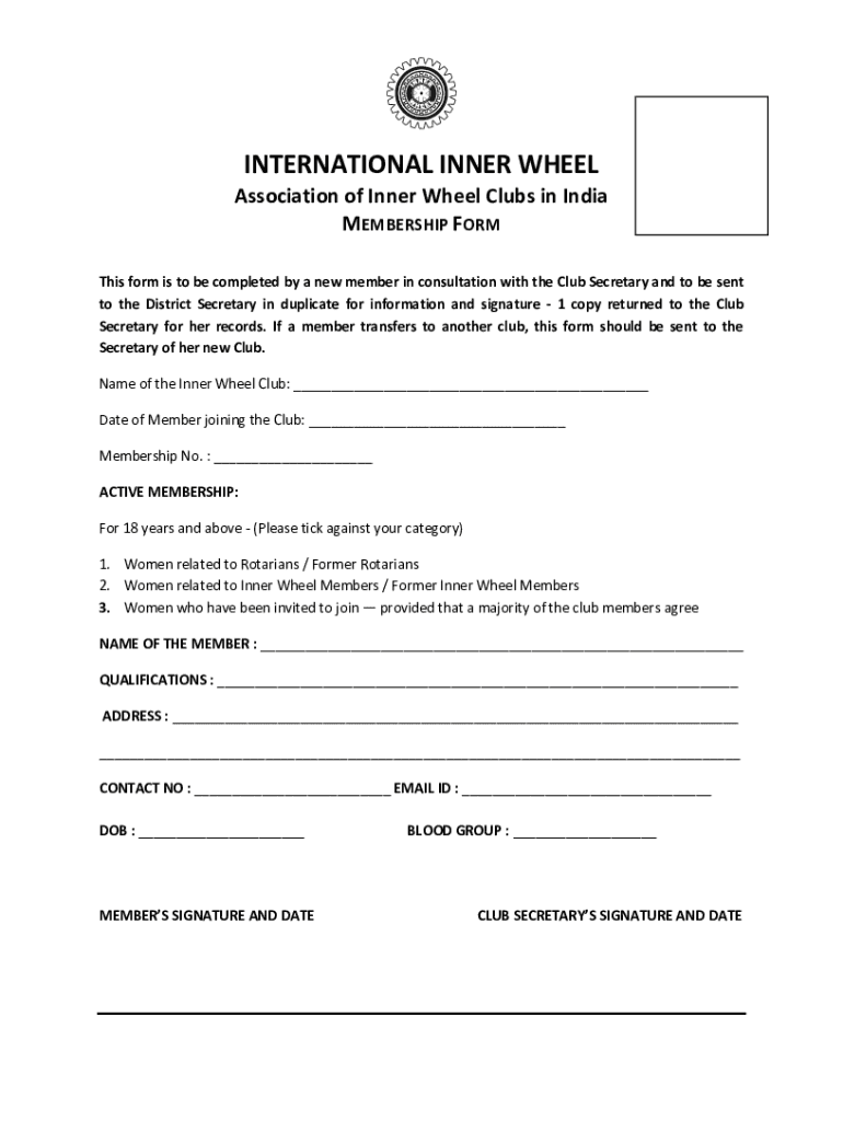 INTERNATIONAL INNER WHEEL Association of Inner Wheel Clubs in India MEMBERSHIP FORM This form is to be completed by a new member in consultation with the Club Secretary and to be sent to the District