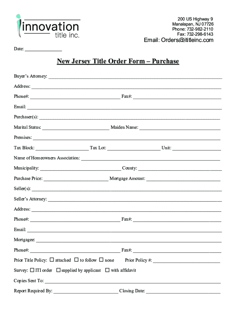 200 US Highway 9 Manalapan, NJ 07726 Phone: 7329822110 Fax: 7322986143Email: Orders ititleinc.com Date: New Jersey Title Order Form Purchase Buyers Attorney: Address: Phone#: Fax#: Email: Purchaser(s):