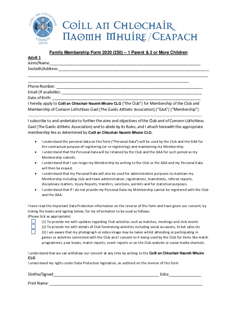 Get the free Family Membership Form 2020 (50) 1 Parent & 2 or More Children