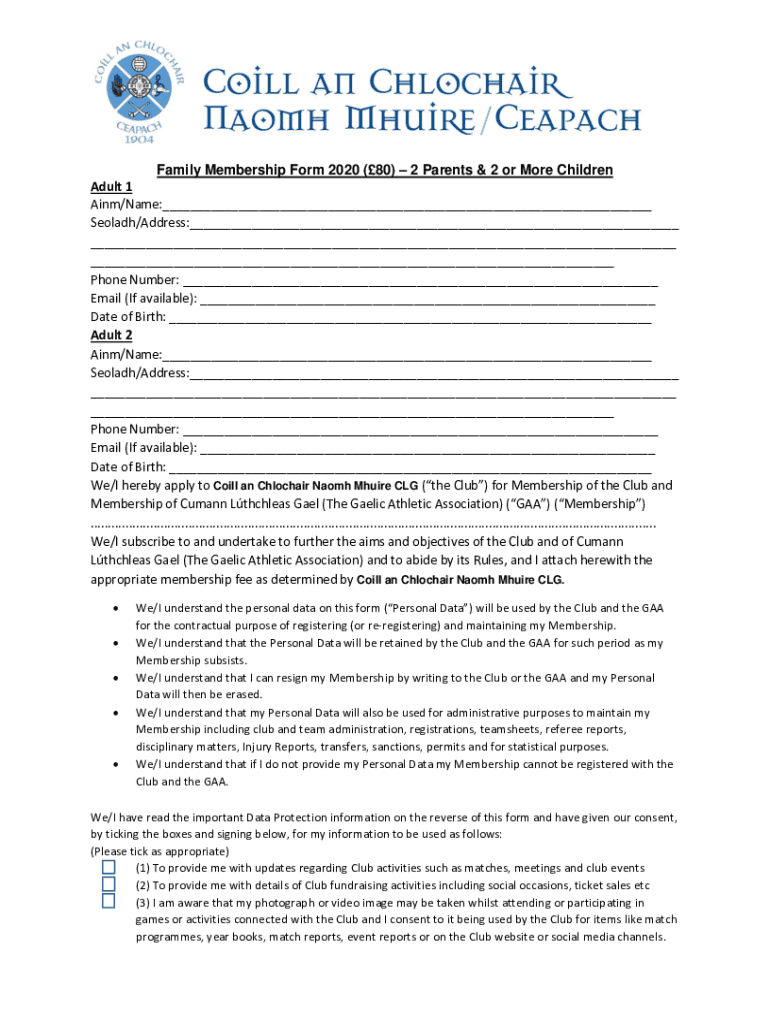 Family Membership Form 2020 (80) 2 Parents & 2 or More Children Adult 1 Ainu/Name: Sold/Address: Phone Number: Email (If available): Date of Birth: Adult 2 Ainu/Name: Sold/Address: Phone Number: Email
