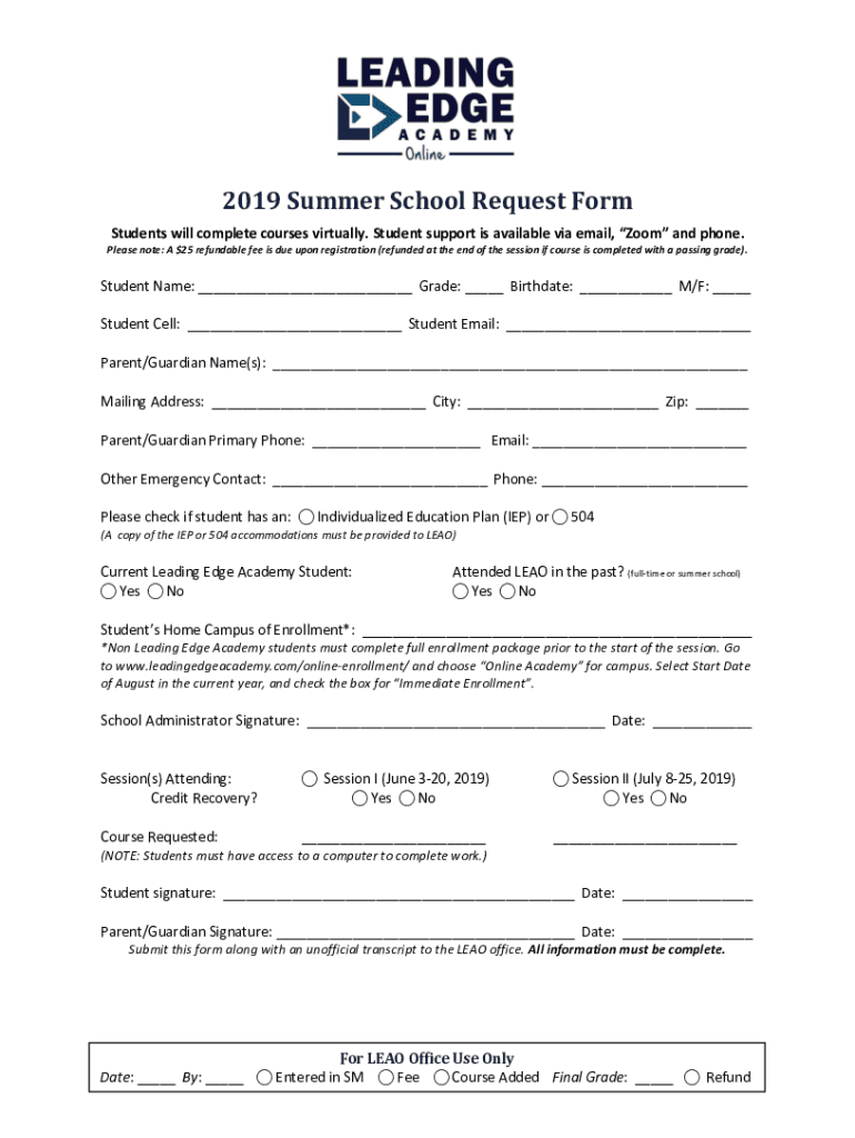 2019 Summer School Request Form Students will complete courses virtually. Student support is available via email, Zoom and phone. Please note: A $25 refundable fee is due upon registration (refunded