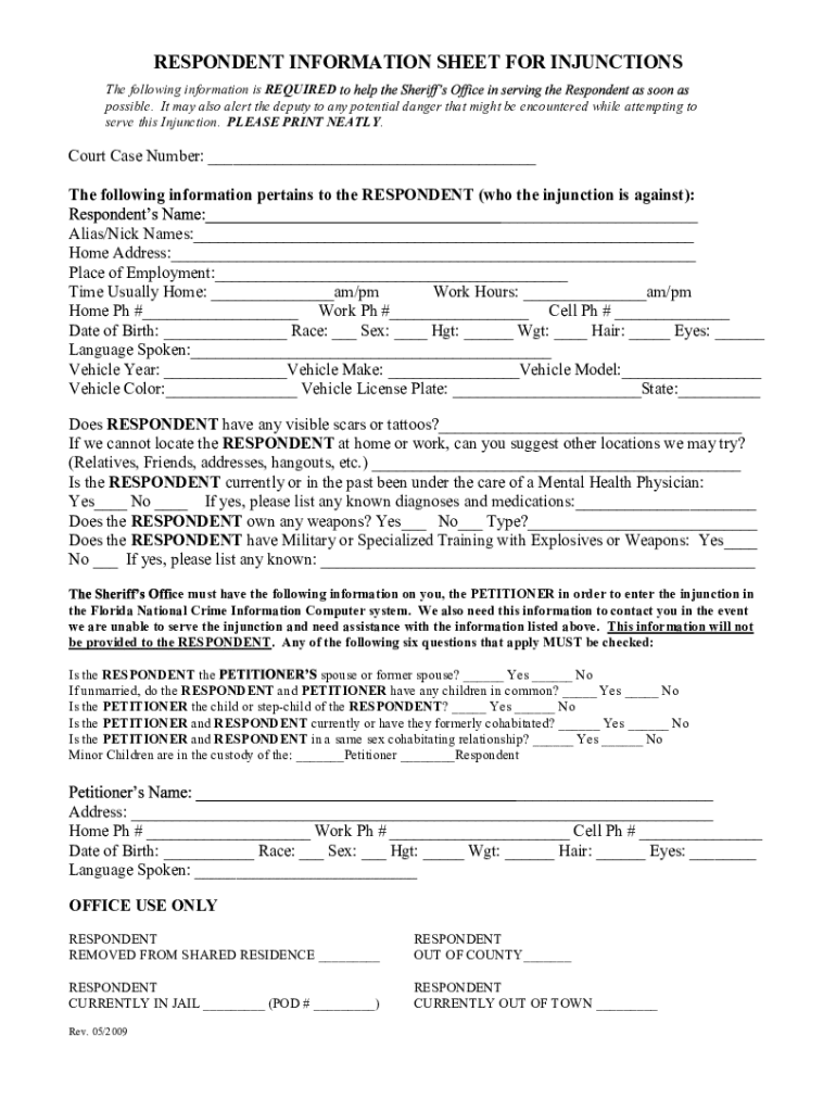 RESPONDENT INFORMATION SHEET FOR INJUNCTIONS The following information is REQUIRED possible. It may also alert the deputy to any potential danger that might be encountered while attempting to serve