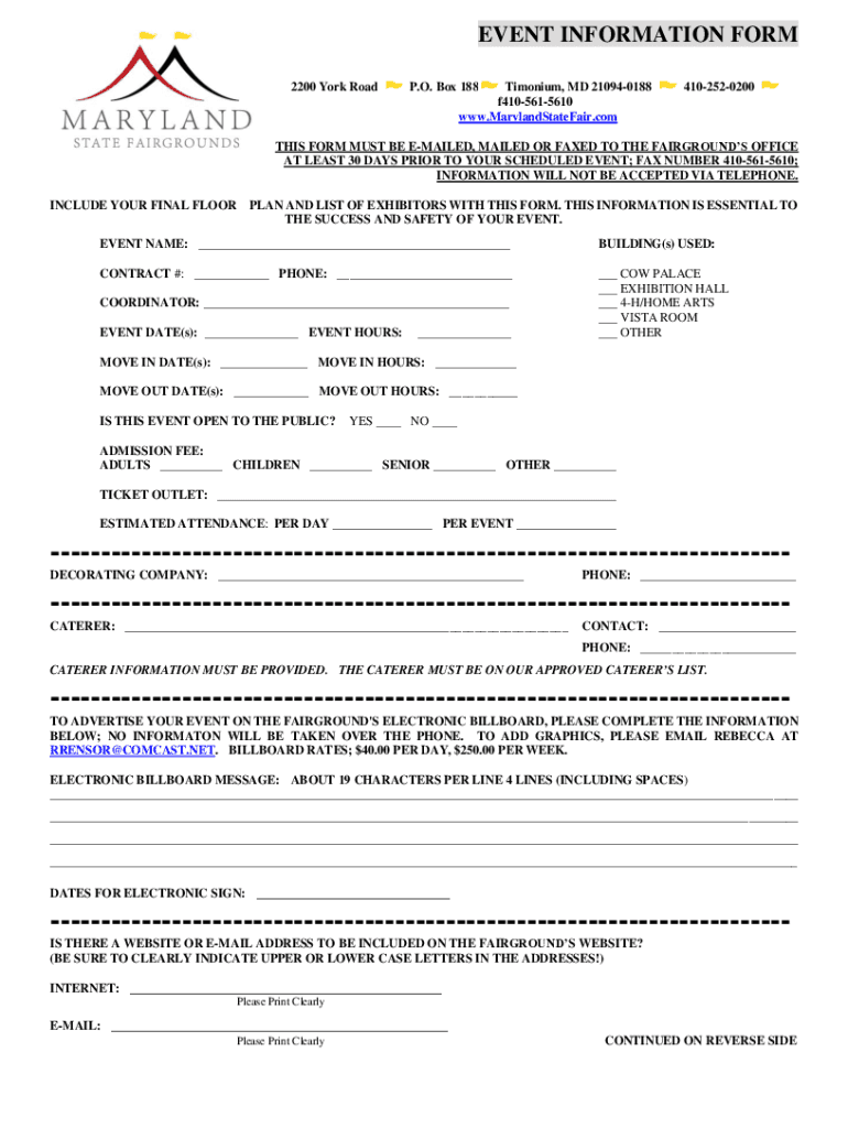 EVENT INFORMATION FORM 2200 York Road. O. Box 188Timonium, MD 210940188 f4105615610 www.MarylandStateFair.com4102520200THIS FORM MUST BE EMAILED, MAILED OR FAXED TO THE FAIRGROUNDS OFFICE AT LEAST