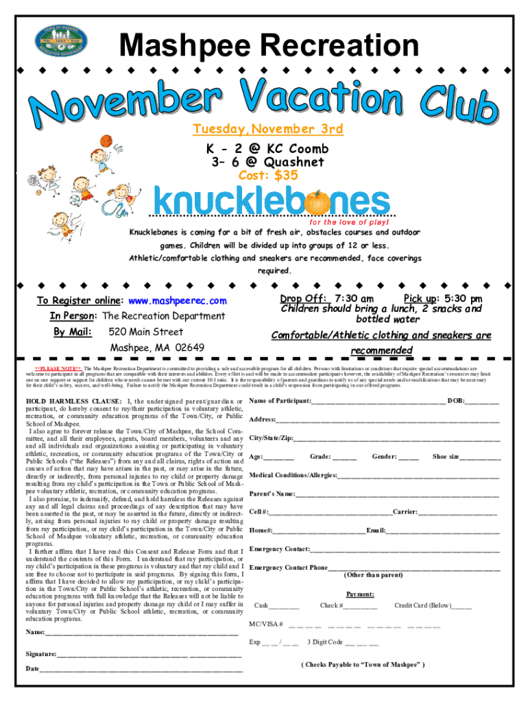 Mash pee Recreation Tuesday,November 3rd K 2 KC Comb 3 6 Quash net Cost: $35Knucklebones is coming for a bit of fresh air, obstacles courses and outdoor games. Children will be divided up into groups