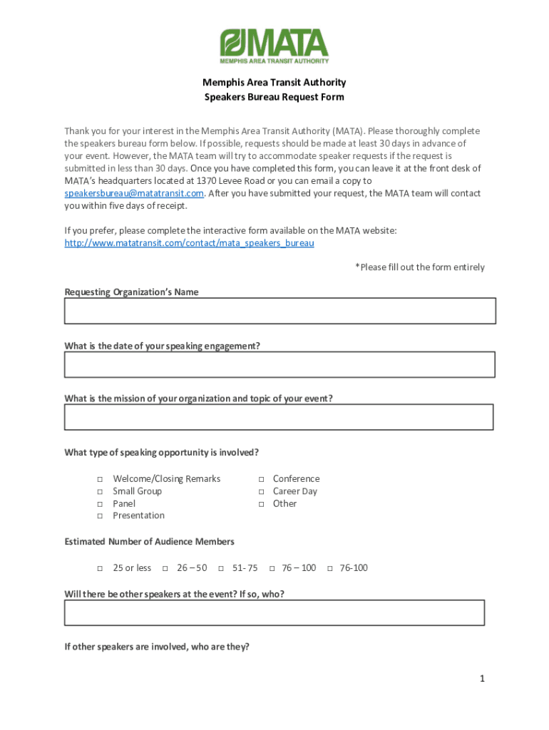 Get the free Memphis Area Transit Authority Speakers Bureau Request Form