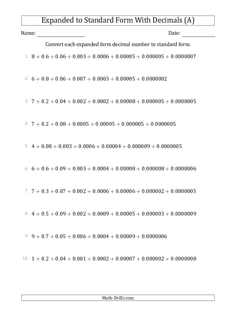 Get the free Decimals Worksheet -- Converting Expanded Form Decimals Using Decimals to Standard F...