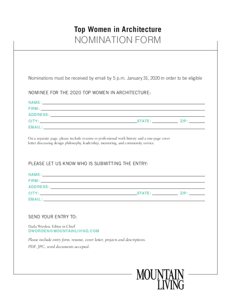 Top Women in ArchitectureNOMINATION FORMNominations must be received by email by 5 p.m. January 31, 2020, in order to be eligible
