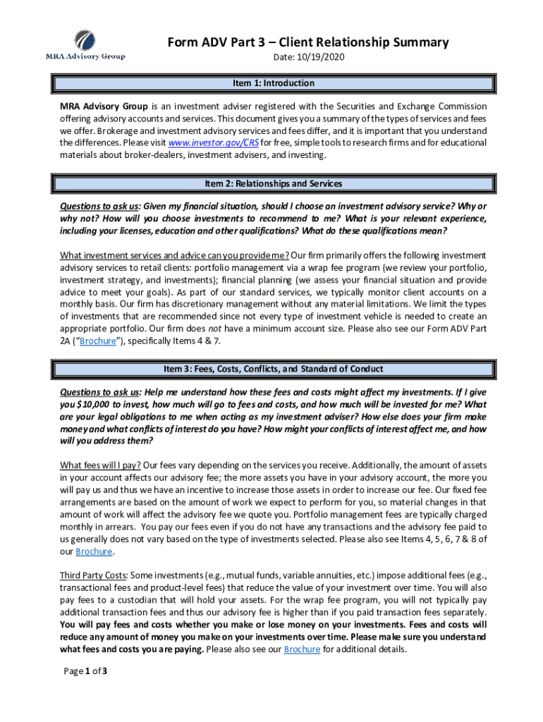 Form ADV Part 3 Client Relationship Summary Date: 10/19/2020 Item 1: Introduction MRA Advisory Group is an investment adviser registered with the Securities and Exchange Commission offering advisory