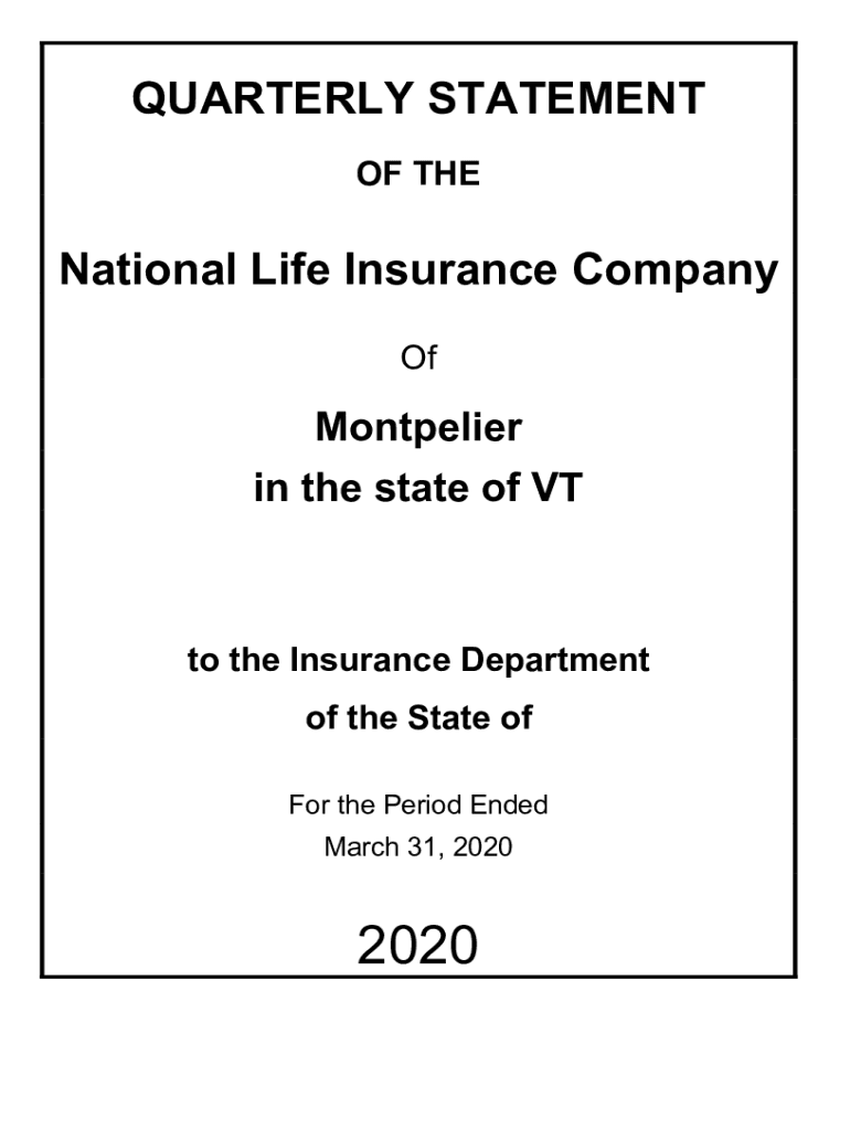 QUARTERLY STATEMENT OF National Life Insurance Company OfMontpelierin the state of Otto the Insurance Department of the State of For the Period Ended March 31, 20202020 LIFE AND ACCIDENT AND HEALTH