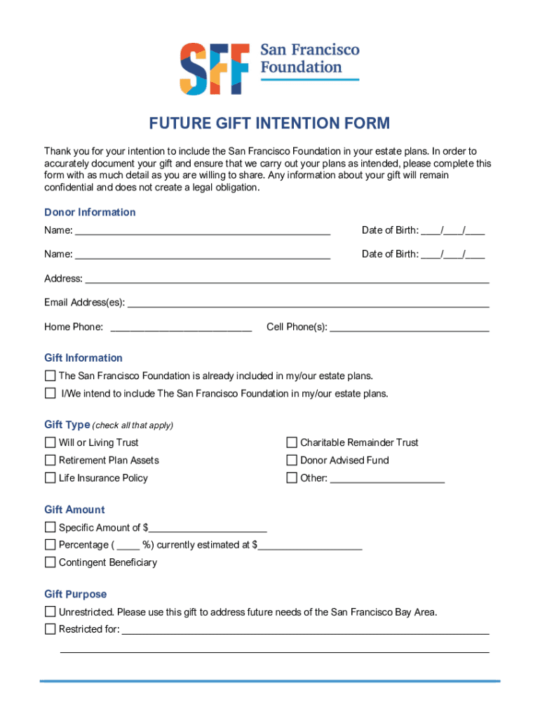 FUTURE GIFT INTENTION FORM Thank you for your intention to include the San Francisco Foundation in your estate plans. In order to accurately document your gift and ensure that we carry out your plans