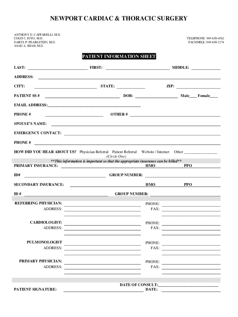 NEWPORT CARDIAC & THORACIC SURGERY ANTHONY D. ZEFFIRELLI, M.D. COLIN I. JOY, M.D. DARYL P. PEARLSTINE, M.D. SAD A. SHAH, M.D.TELEPHONE: 9496504562 FACSIMILE: 9496501274PATIENT INFORMATION SHEET LAST:FIRST:MIDDLE:ADDRESS: