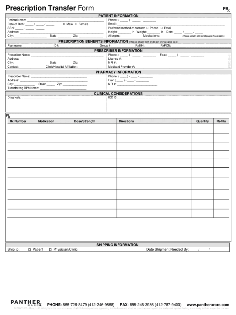 Prescription Transfer Form PATIENT INFORMATION Patient Name: Date of Birth: / / Male Female SSN: Address: City: State: Zip: Phone: () Email: Preferred method of contact: Phone Email Height: in Weight: