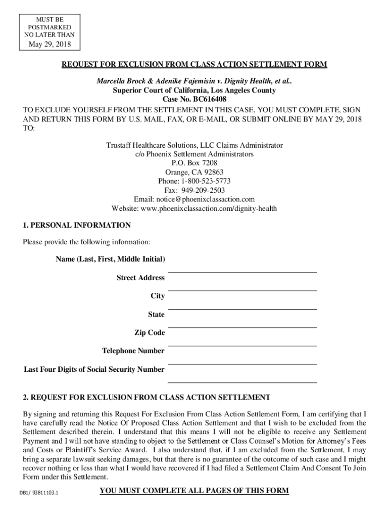 MUST BE POSTMARKED NO LATER THAN May 29, 2018, REQUEST FOR EXCLUSION FROM CLASS ACTION SETTLEMENT FORM Marcella Brock & Adenine Jemison v. Dignity Health, et al. Superior Court of California, Los
