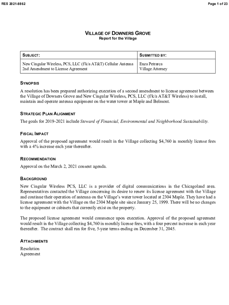 RES 20218862Page 1 of 23VILLAGE OF DOWNERS GROVE Report for the VillageSUBJECT:SUBMITTED BY:New Singular Wireless, PCS, LLC (f/k/an AT&T) Cellular Antenna 2nd Amendment to License AgreementEnza Petrarch