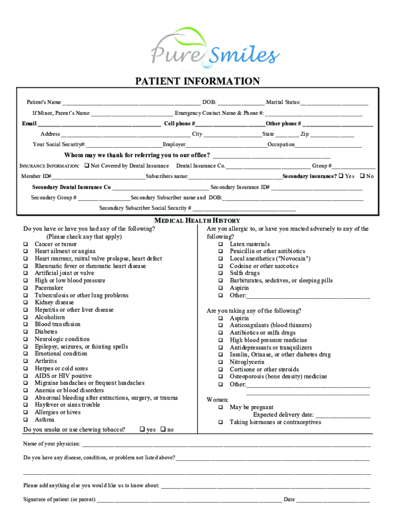 The patient information form typically requires details such as the patient's name, date of birth, medical history, current medications, allergies, insurance information, emergency contacts, and consent for treatment.