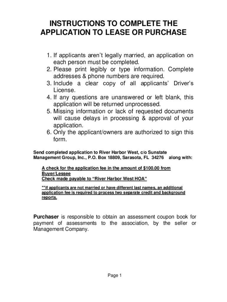 INSTRUCTIONS TO COMPLETE THE APPLICATION TO LEASE OR PURCHASE 1. If applicants aren't legally married, an application on each person must be completed. 2. Please print legibly or type information.