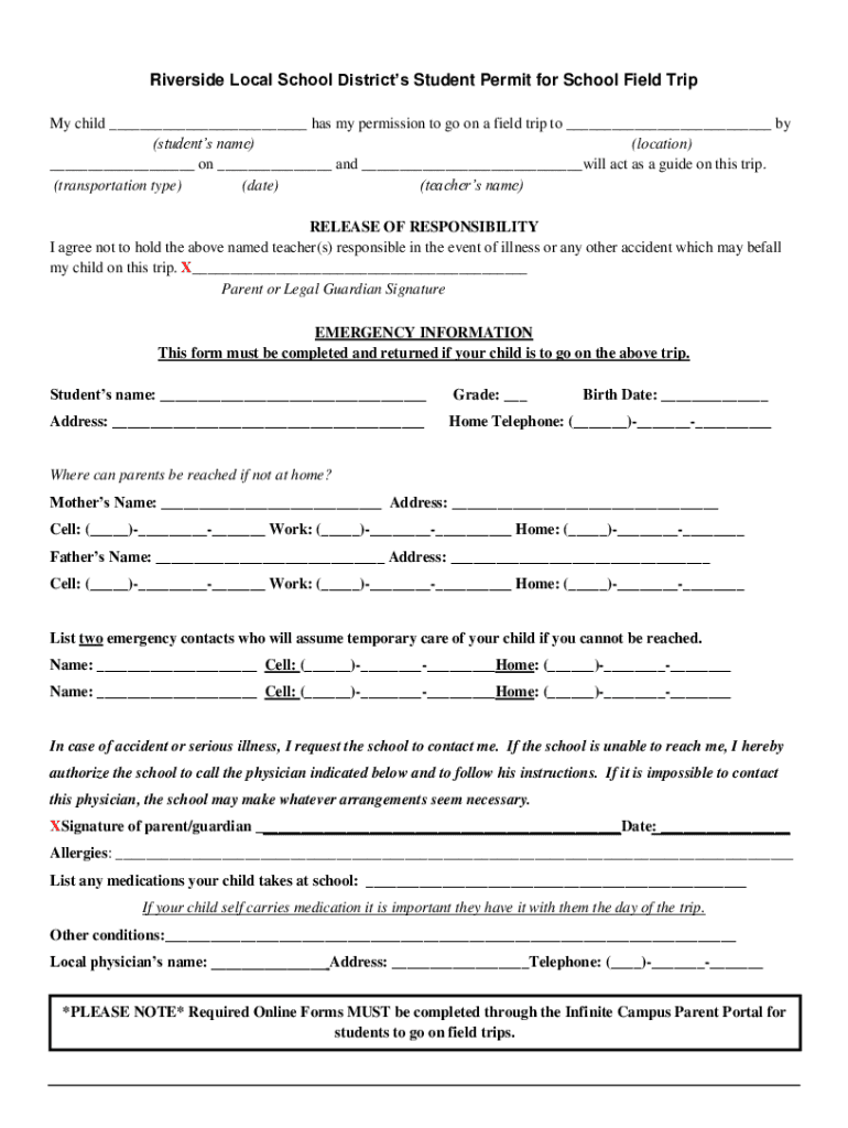 Riverside Local School Districts Student Permit for School Field Trip My child has my permission to go on a field trip to by (students name) (location) on and will act as a guide on this trip. (transportation