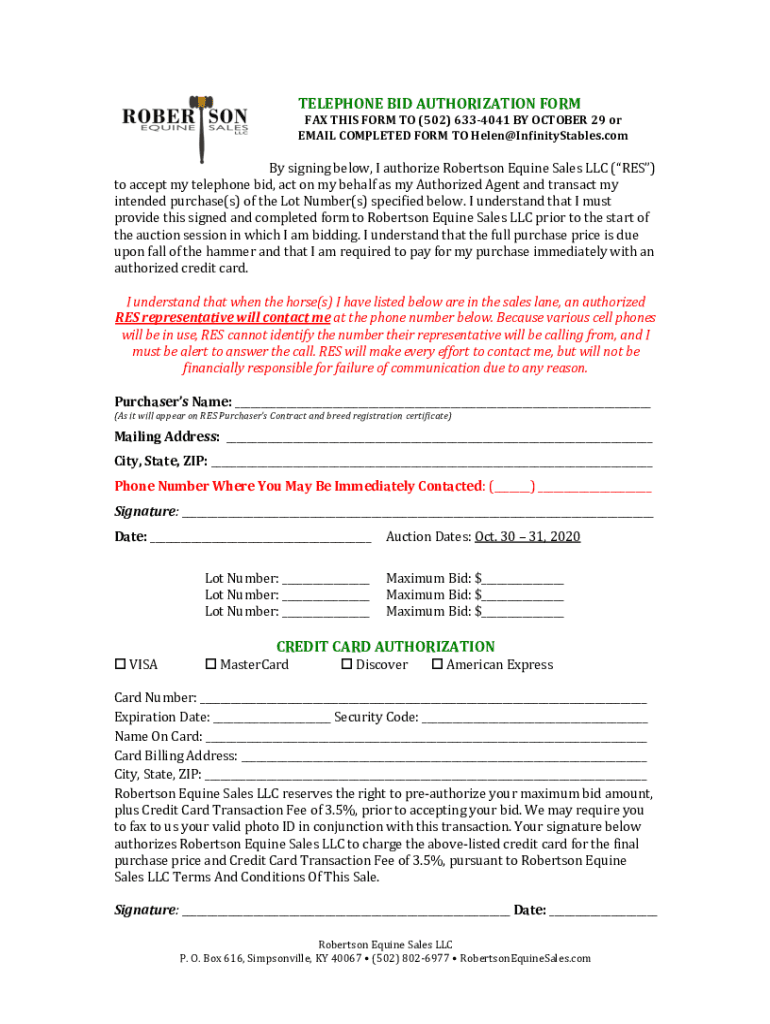 TELEPHONE BID AUTHORIZATION FORM FAX THIS FORM TO (502) 6334041 BY OCTOBER 29 remain COMPLETED FORM TO Helen@InfinityStables.comBy signing below, I authorize Robertson Equine Sales LLC (RES)to accept my telephone bid, act on my behalf as my Authorized Agent and transact my