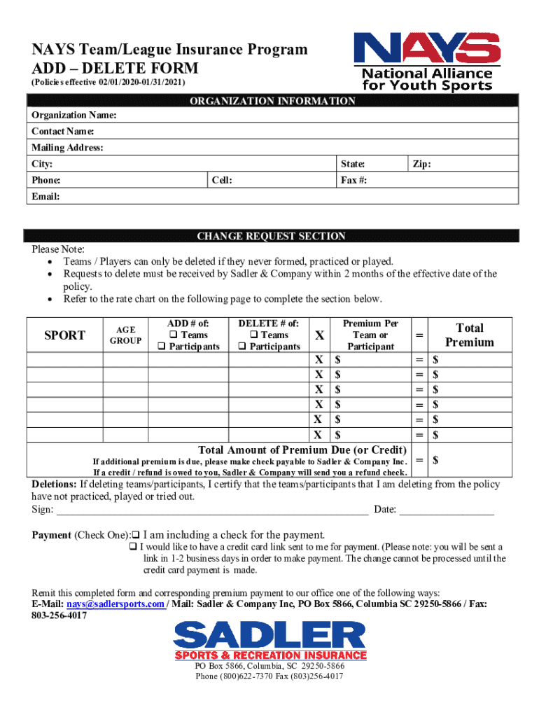 Get the free NAYS Team/League Insurance Program ADD DELETE FORM