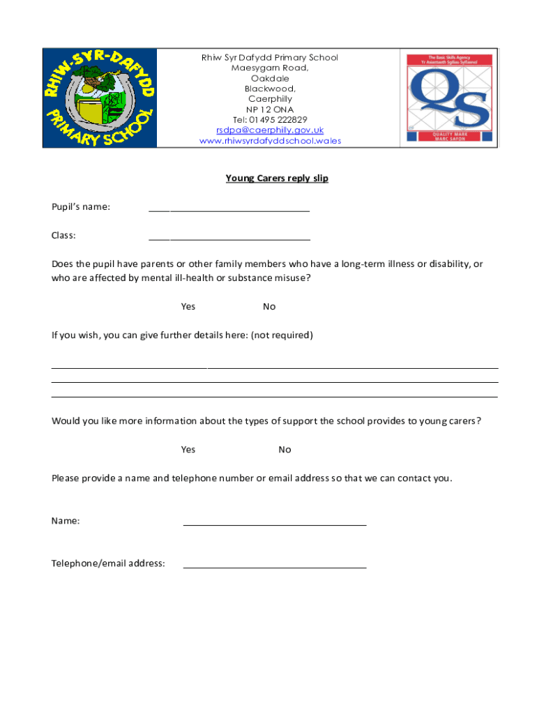 This SYR Deified Primary School Maesygarn Road, Oakdale Blackwood, Caerphilly NP 12 ON Tel: 01495 222829 spa Caerphilly.gov.UK www.rhiwsyrdafyddschool.walesYoung Carers reply slip Pupils name: Class: