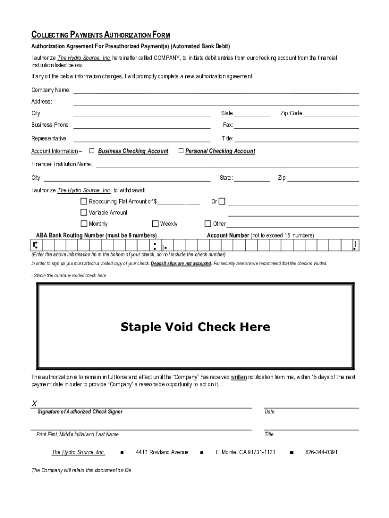 COLLECTING PAYMENTS AUTHORIZATION FORM Authorization Agreement For Preauthorized Payment(s) (Automated Bank Debit) I authorize The Hydro Source, Inc. hereinafter called COMPANY, to initiate debit