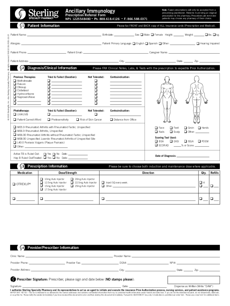 Ancillary Immunology Prescription Referral Form NPI: 1225548480 2020 Sterling Rx, Inc. DBA Sterling Specialty Pharmacy. All rights reserved. 918.02.00202010151Ph: 888.618.4126Patient Information: