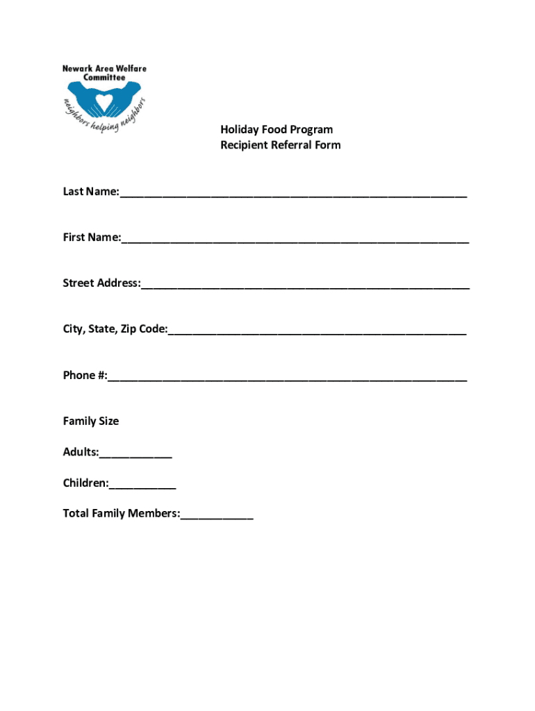 Holiday Food Program Recipient Referral Format Name: First Name: Street Address: City, State, Zip Code: Phone #: Family Size Adults: Children: Total Family Members:
