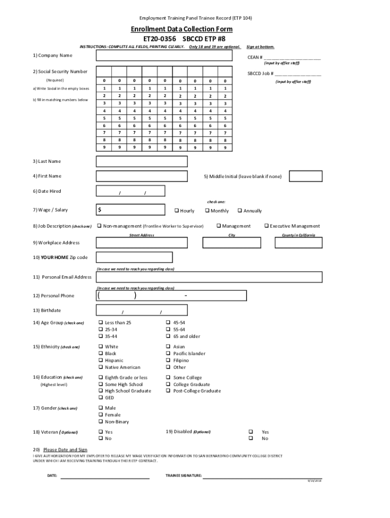 Get the free Enrollment Data Collection Form ET20-0356 SBCCD ETP #8