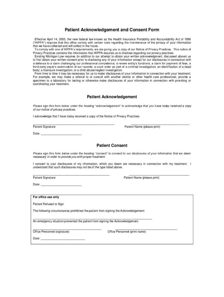 Patient acknowledgement and consent forms also ensure that patients are well-informed about their rights, responsibilities, and the nature of their healthcare.