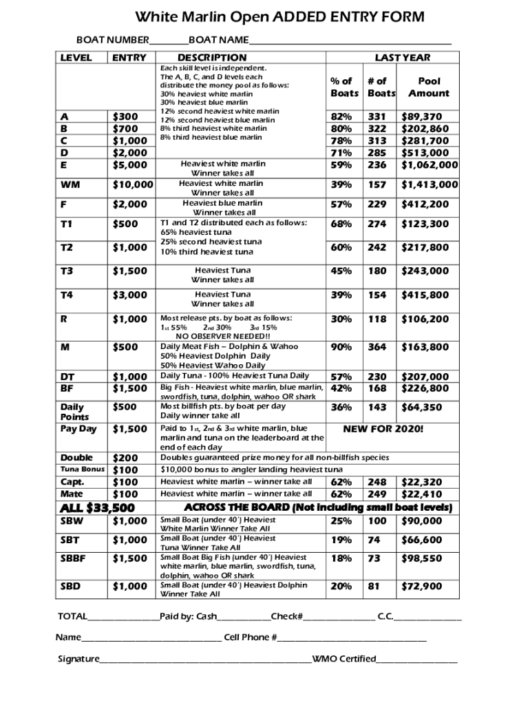 White Marlin Open ADDED ENTRY FORM BOAT NUMBER BOAT NAME LEVELENTRYA B C D E$$$$$3007001,0002,0005,000WM$10,000F$2,000T$1500T$21,000T$31,500T$43,000R$1,000M$500DT BF$$1,0001,500Daily Points Pay Day$500Double$$$$200100100100Tuna