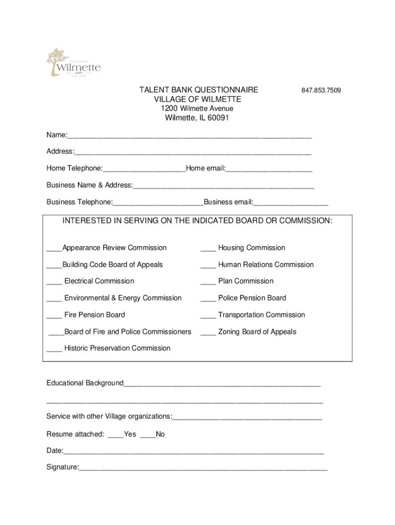 TALENT BANK QUESTIONNAIRE VILLAGE OF WILMETTE 1200 Wilmette Avenue Wilmette, IL 60091847.853.7509Name: Address: Home Telephone: Home email: Business Name & Address: Business Telephone: Business email: