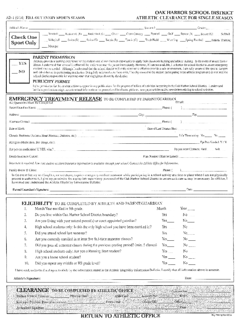 OAK HARBOR SCHOOL DISTRICT ATHLETIC CLEARANCE FOR SINGLE SEASONAL. T (6114) FILL OUT EVERY SPORTS SEASON Athlete's Name:Grade:: Student # Check One Sport Only Baseball VolleyballBasketball (B) Swim