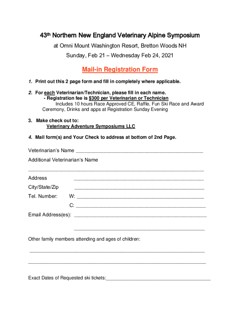 43rd Northern New England Veterinary Alpine Symposium at OFNI Mount Washington Resort, Bretton Woods NH Sunday, Feb 21 Wednesday Feb 24, 2021Mailin Registration Form 1. Print out this 2-page form