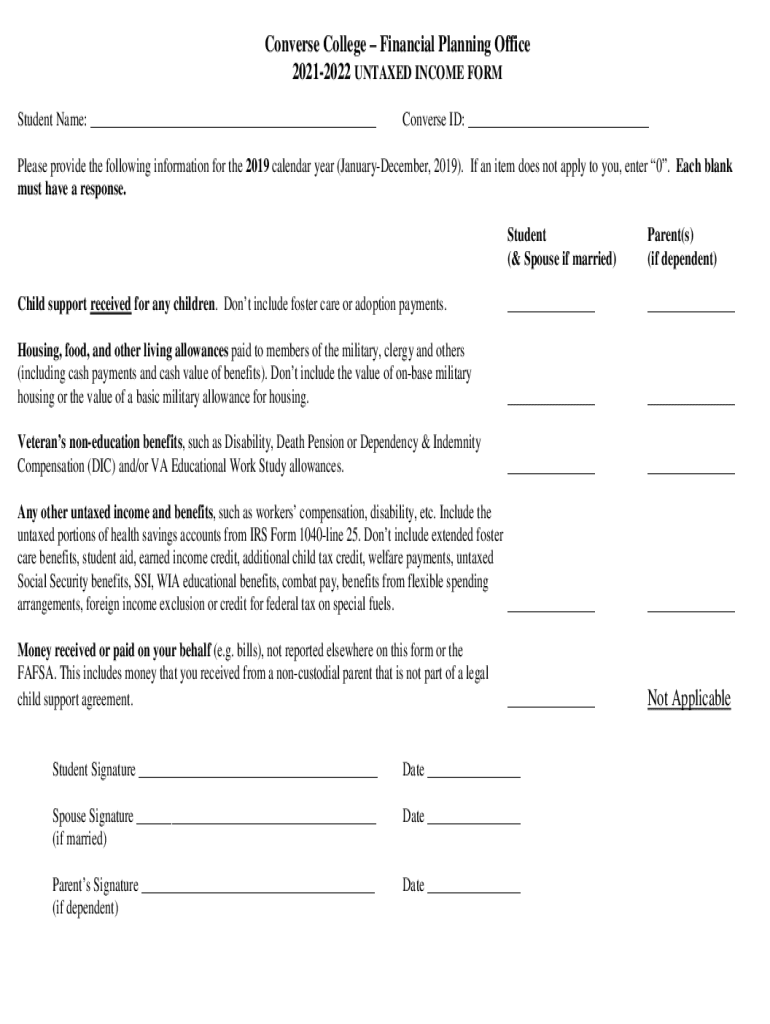 Converse College Financial Planning Office 20212022 UNTAMED INCOME FORM Student Name: Converse ID: Please provide the following information for the 2019 calendar year (January December 2019). If an