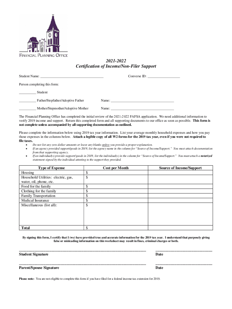 20212022 Certification of Income/Confider Support Student Name: Converse ID: Person completing this form: Student Father/Stepfather/Adoptive Fatherland: Mother/Stepmother/Adoptive Motherland: The