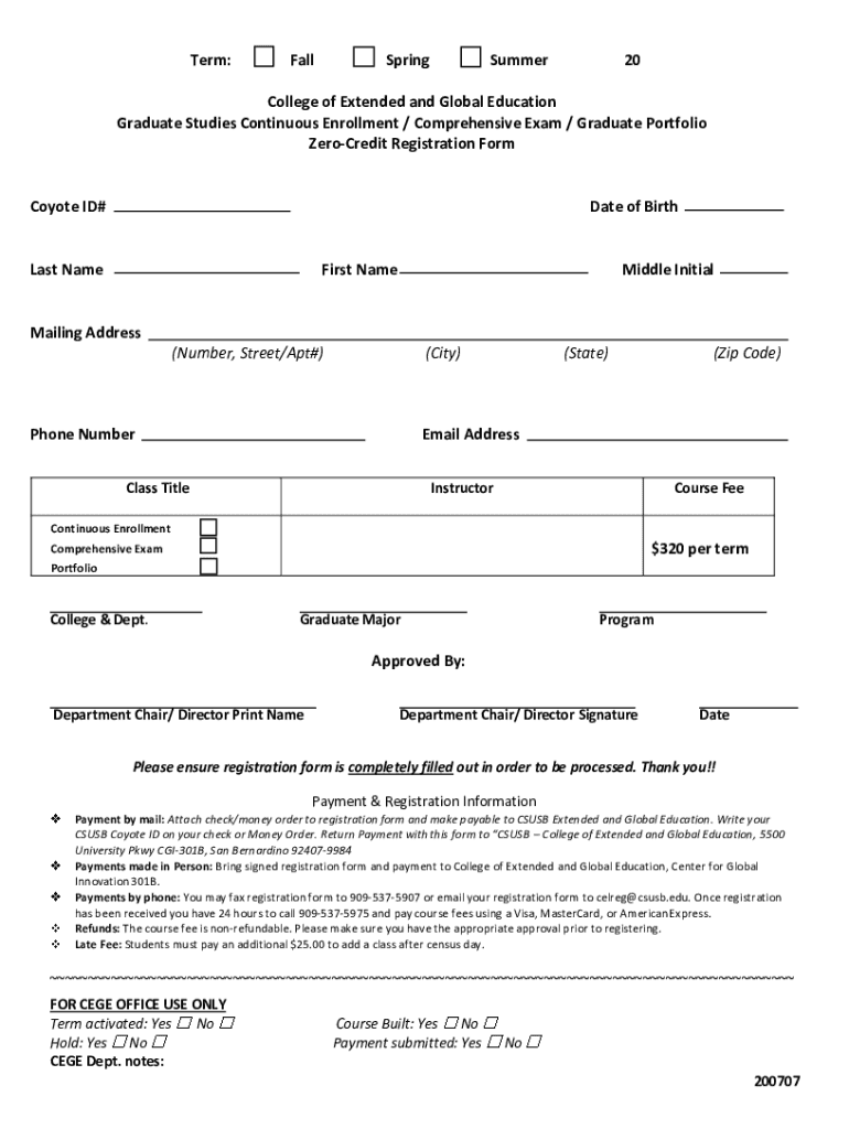 Term:FallSpringSummer20College of Extended and Global Education Graduate Studies Continuous Enrollment / Comprehensive Exam / Graduate Portfolio Microcredit Registration FormCoyote ID#Date of Northeast