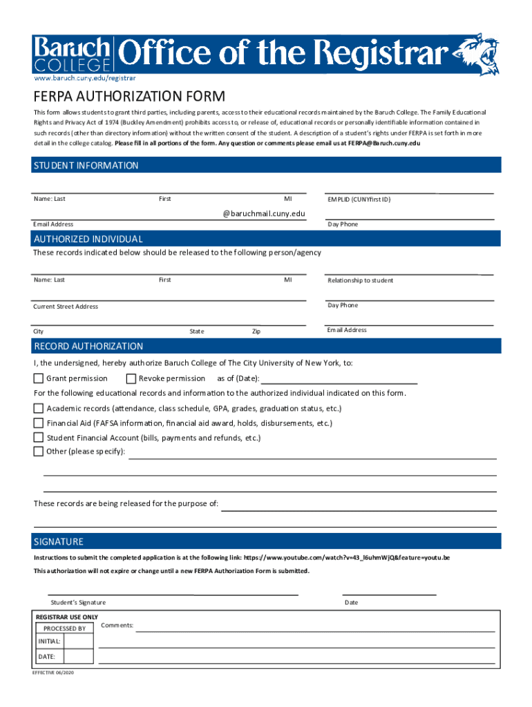 The FERPA Authorization Form is designed for students at Baruch College who want to authorize access to their educational records by third parties, including parents and guardians.