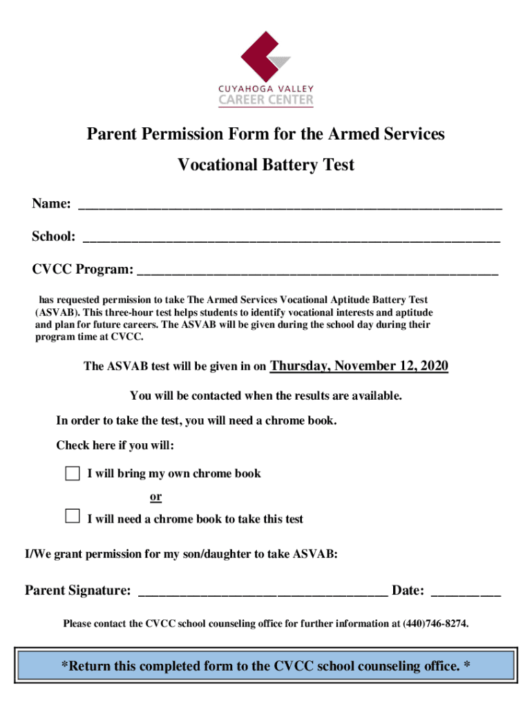 Parent Permission Form for the Armed Services Vocational Battery Test Name: School: CCC Program: has requested permission to take The Armed Services Vocational Aptitude Battery Test (AS VAB). This