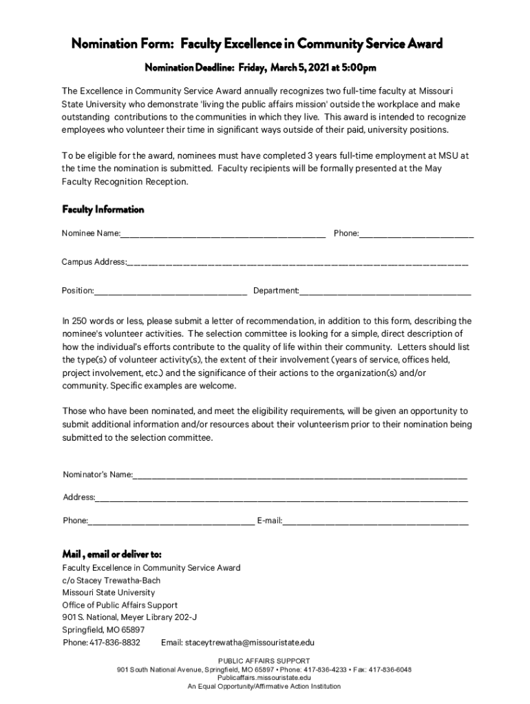 Nomination Form: Faculty Excellence in Community Service Award Nomination Deadline: Friday, March 5, 2021, at 5:00pm The Excellence in Community Service Award annually recognizes two full time faculty