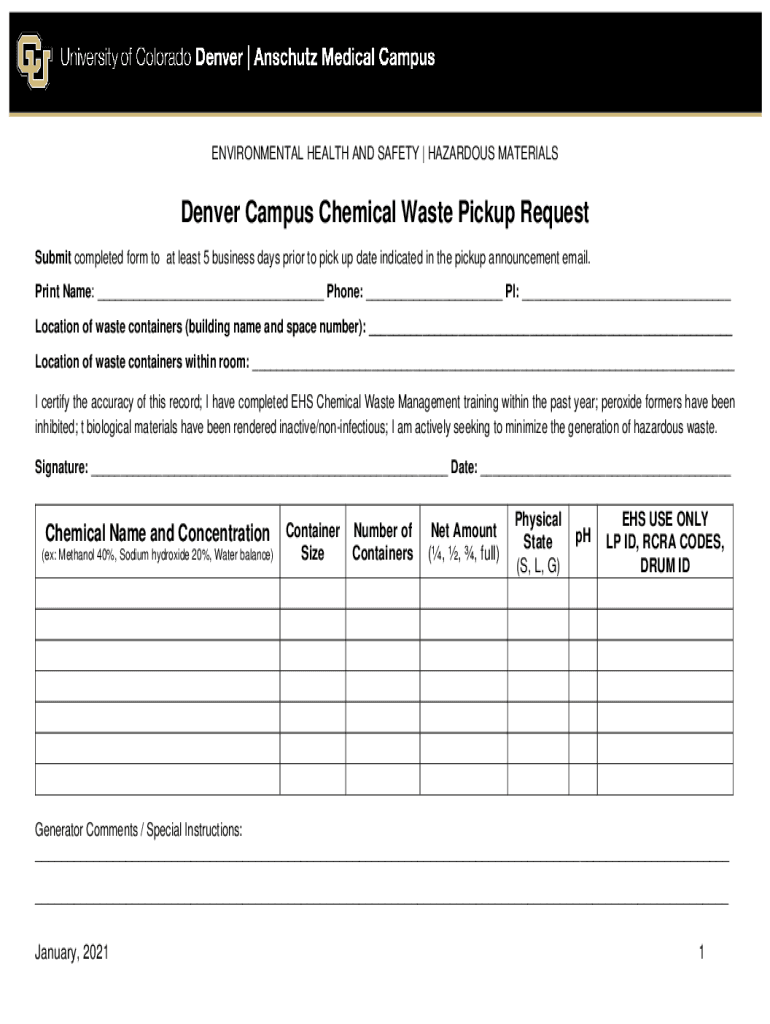 ENVIRONMENTAL HEALTH AND SAFETY HAZARDOUS MATERIALS Denver Campus Chemical Waste Pickup Request Submit completed form to at least 5 business days prior to pick up date indicated in the pickup announcement