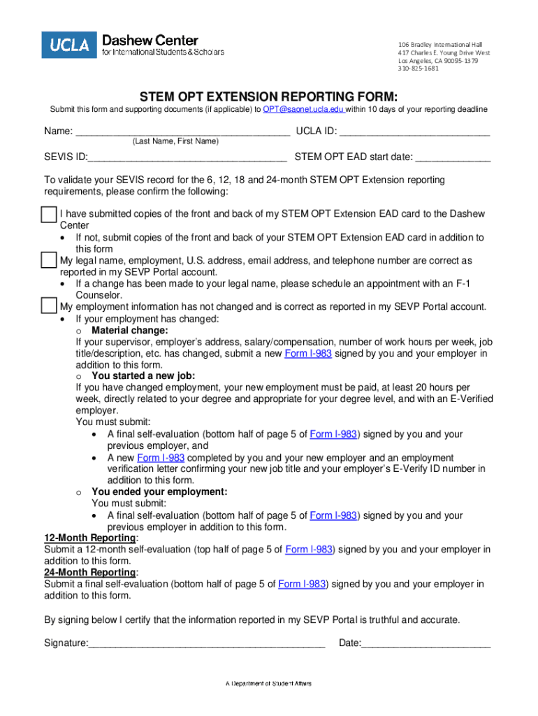 106 Bradley International Hall 417 Charles E. Young Drive West Los Angeles, CA 900951379 3108251681STEM OPT EXTENSION REPORTING FORM: Submit this form and supporting documents (if applicable) to OPT