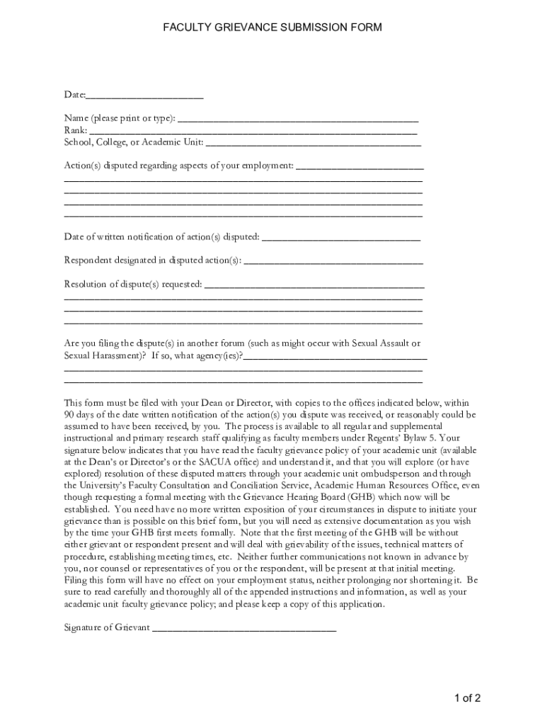 FACULTY GRIEVANCE SUBMISSION Format: Name (please print or type): Rank: School, College, or Academic Unit: Action(s) disputed regarding aspects of your employment: Date of written notification of