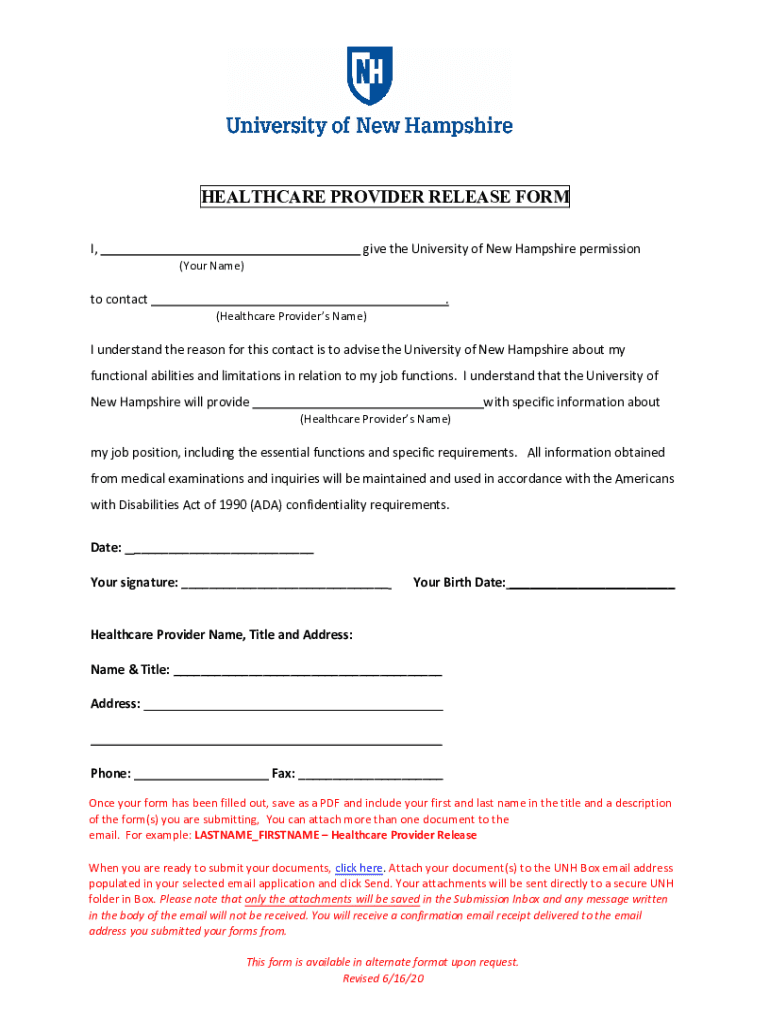 to contact give the University of New Hampshire permission(Your Name).(Healthcare Providers Name)I understand the reason for this contact is to advise the University