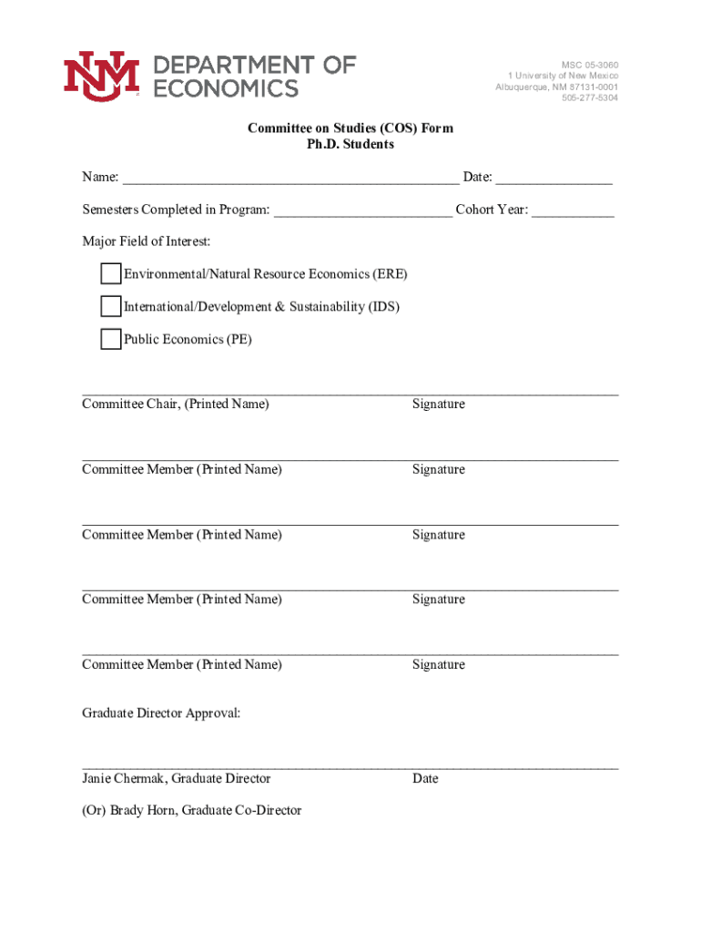 MSC 053060 1 University of New Mexico Albuquerque, NM 871310001 5052775304Committee on Studies (COS) Form Ph.D. Students Name: Date: Semesters Completed in Program: Cohort Year: Major Field of Interest: